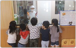 「今日の給食何ですか?」「人参の皮むいてる!○○ちゃんもむけるでぇ!」と元気な声を聞かせてくれます。食材を見ることにより、食に対する興味が湧き、お手伝いやクッキング・昼食やおやつへの楽しみにもつながっています。保育士と連携をとりながら、子ども達の健やかな成長を願い日々の給食作りをしています。